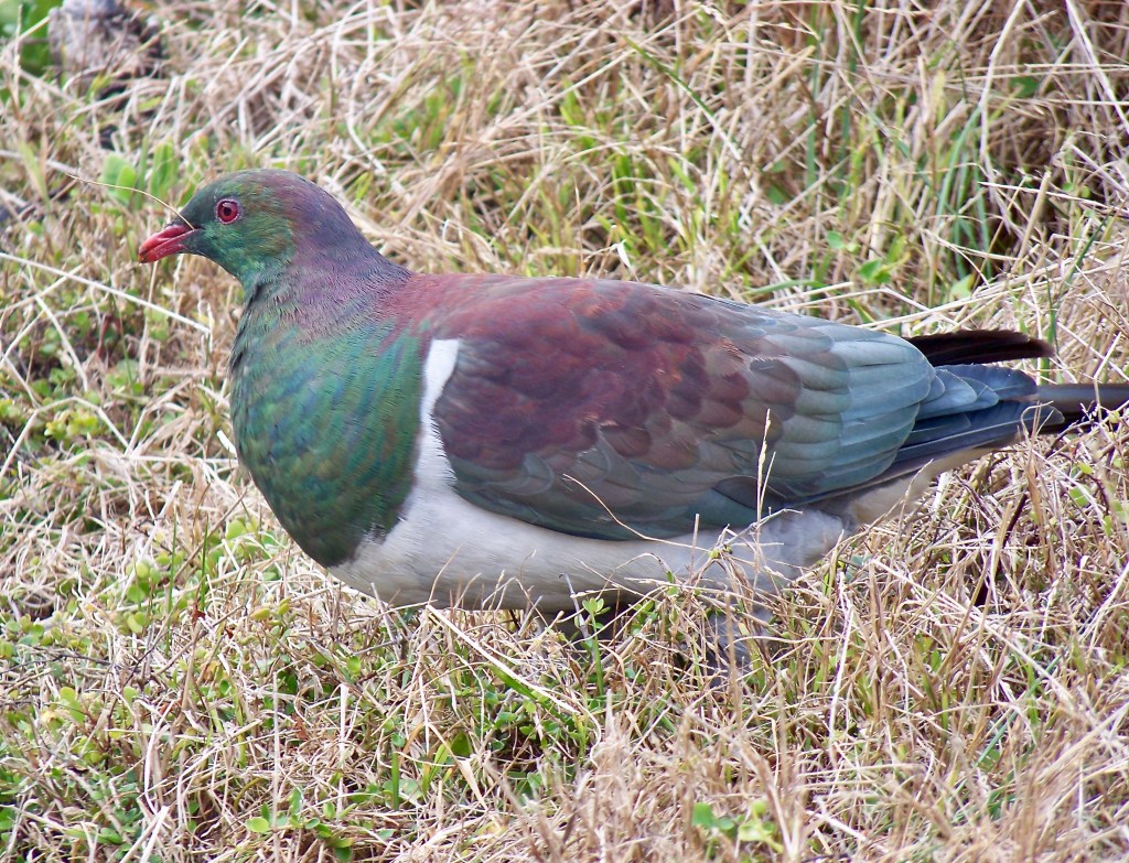 Kereru make occasional soft coo sounds. Their wings make a very distinctive “whooshing” sound as they fly. It’s very loud and unmistakably a kereru, even though you may not see the bird. The are quiet birds, seemingly disinterested in us, potting around on the ground looking for fruit, leaves, twigs, buds, and shoots of over a hundred native, and fifty exotic, shrubs and trees. Occasionally, they gorge so heavily on ripe fruit that they become very full (or “drunk”) and have been known to fall out of trees.